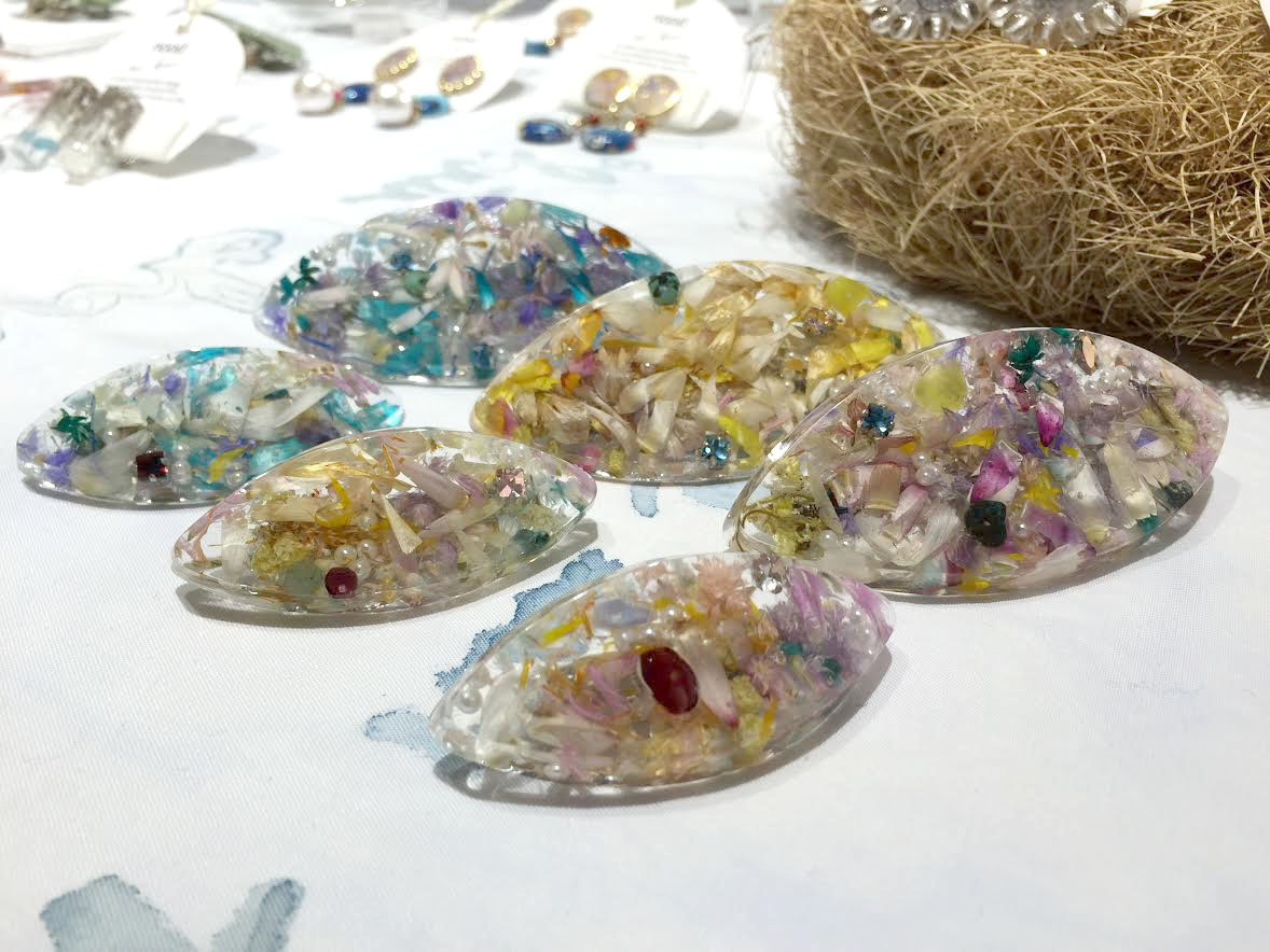 こちらは、色とりどりのドライフラワーや天然石・パールたちが、