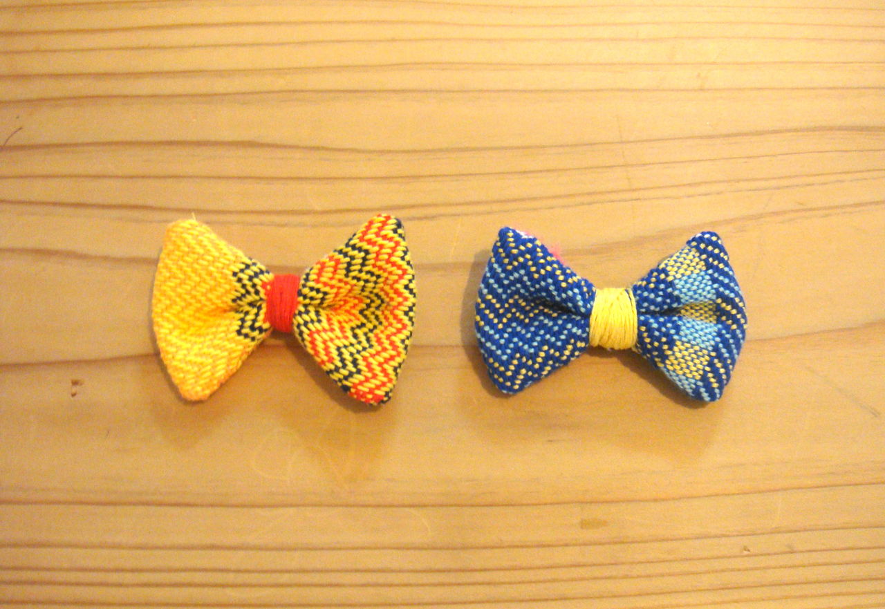 胸元やかばんにもつけれる小ぶりのリボンブローチ。