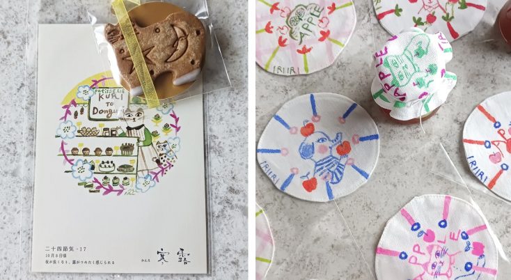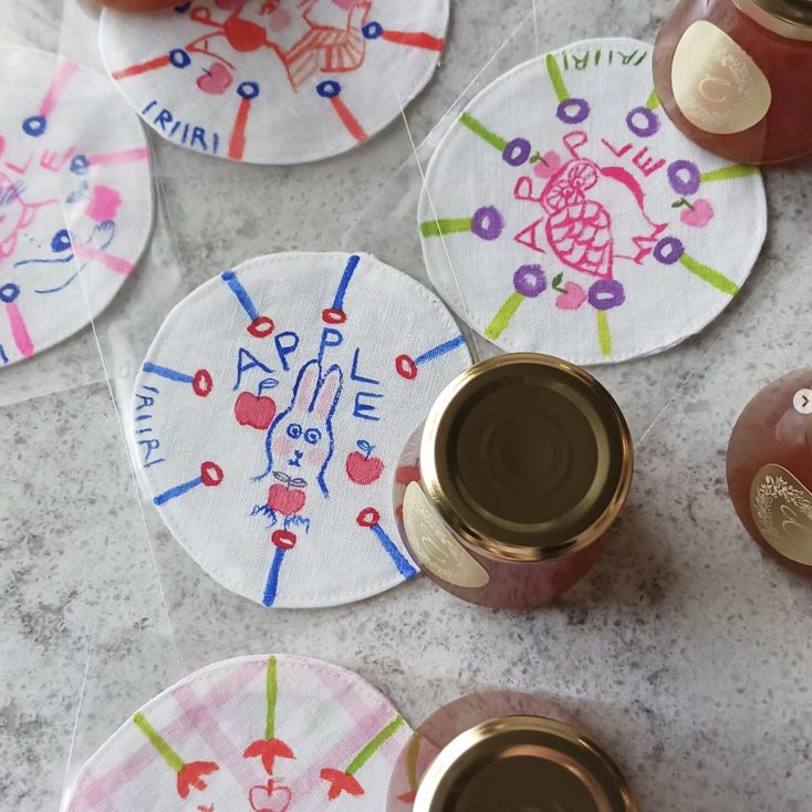 *IRIIRIキャラクター絵柄のリネンコースターは全てハンドペイントの一点もの。ジャムの蓋カバーにも!