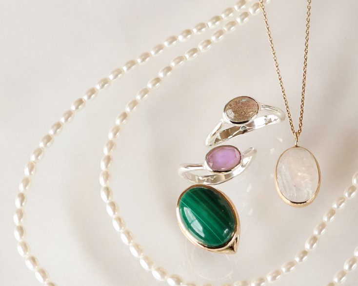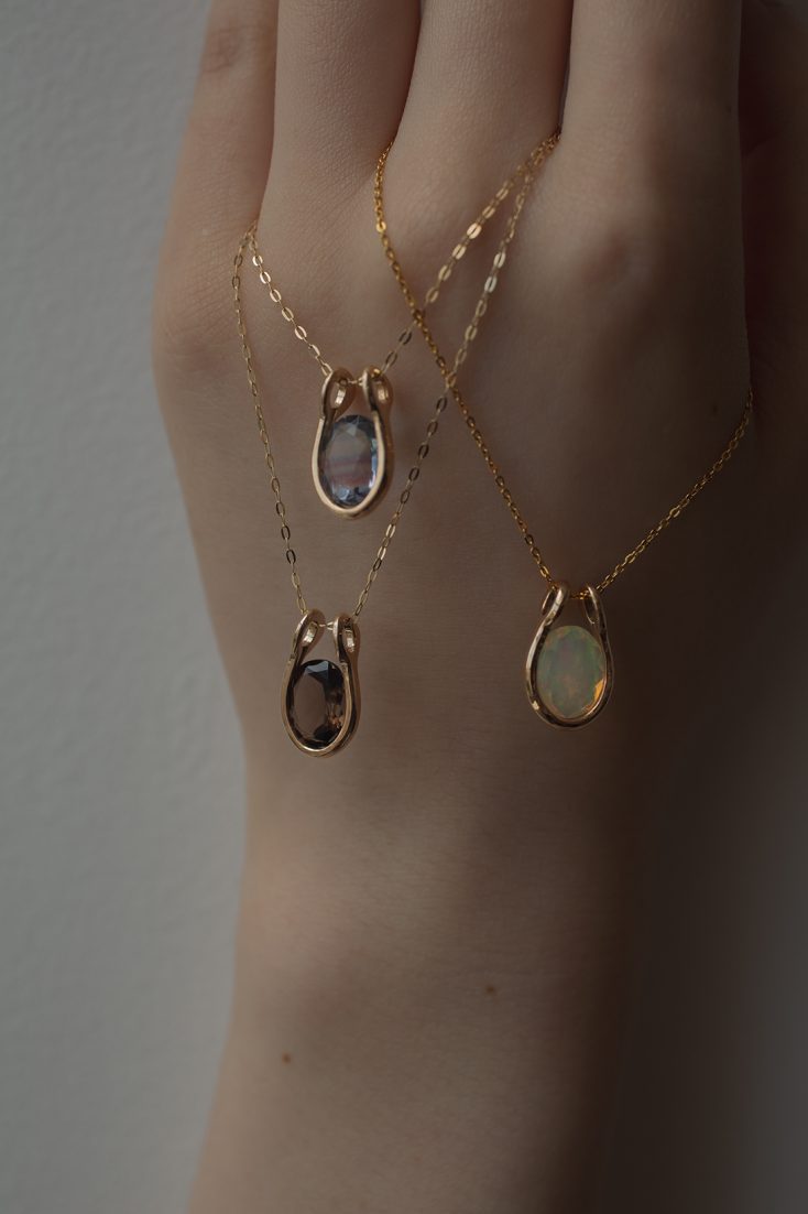 a-corinne(エーコリーヌ)では、デザイナーが厳選した天然石やパールを主にK10YGを使い華奢で繊細なジュエリーにお仕立てしています。お守りの石を美しく纏っていただきたいという思いから、着けた人を美しく輝かせるデザインになるよう心がけています。