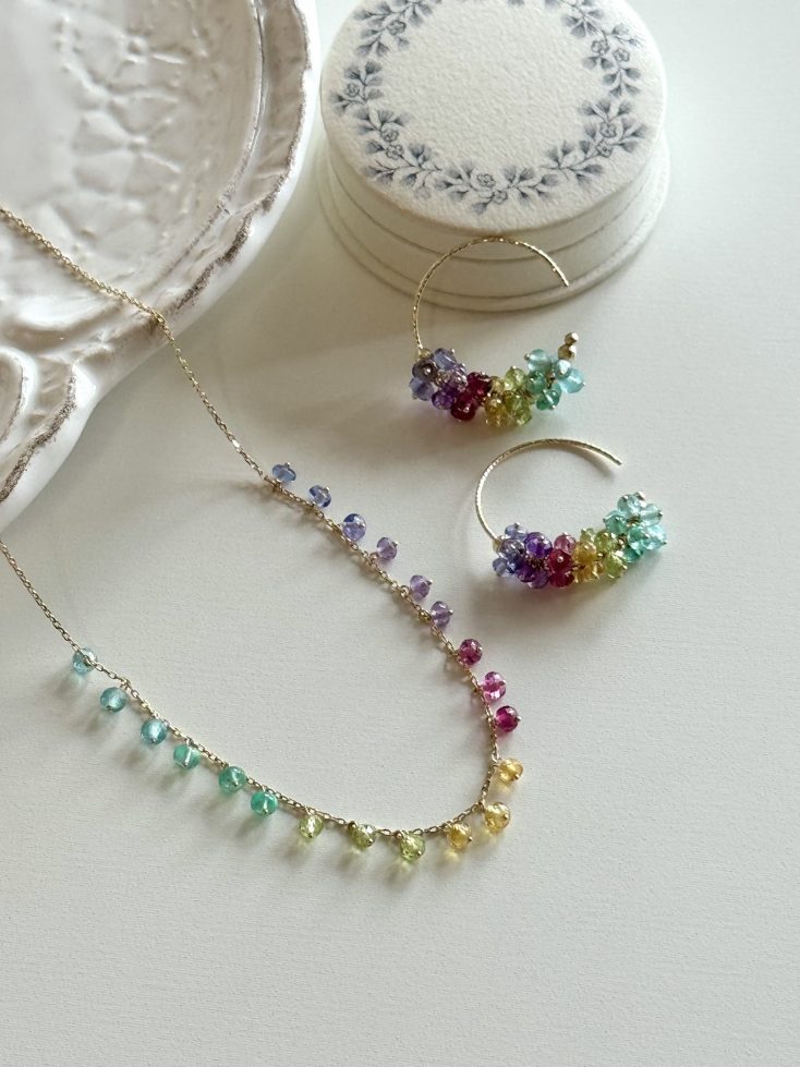 タンザナイト・アメジスト・ピンクトルマリン・イエローサファイア・ペリドット・エメラルド・アパタイトで作った虹色のグラデーション レインボーfluffyネックレス K10 ¥75,900/レインボーfluffyフープピアス K10 ¥115,500