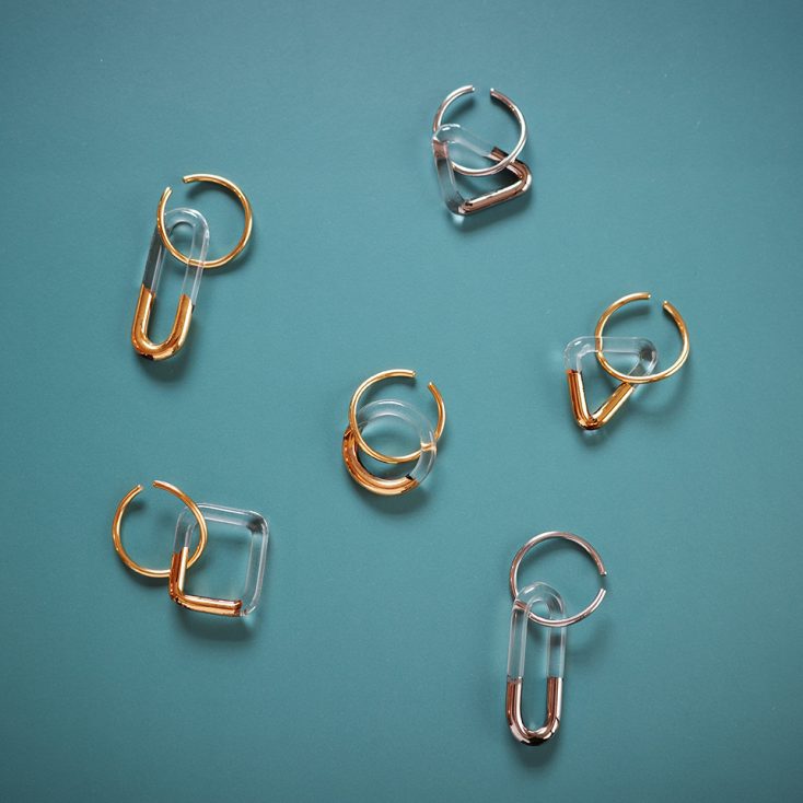 左上 チェーンネックレス 22000円(税込)、左下 丸リング 5500円(税込)、真ん中上段 stickピアス 7700円(税込)、丸と線のピアス 7150円(税込)※ポスト:14kgf、右 重なる〇ネックレス 8800円(税込)※ステンレスチェーン