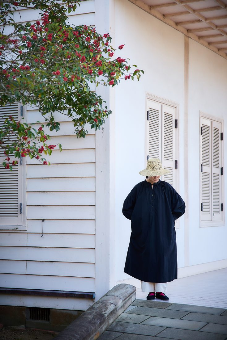 アンティークのスモックドレスをイメージしたワンピース。リボン付きのスタンドカラーとボタンが特徴で、前を開けて羽織ることも可能。高密度タイプライター生地を丁寧にもみほぐし、やわらかくナチュラルな風合いに。両サイドにポケット付き。重ね着も楽しめます。27,500円