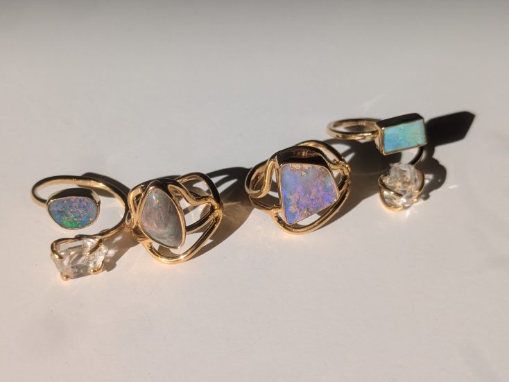 左からリング(K10、オーストラリア産ホワイトオパール)税込104,500円 重ね付け下リング(K10、ダイヤモンド)税込64,900円 右リング(K10、カービング水晶)税込132,000円