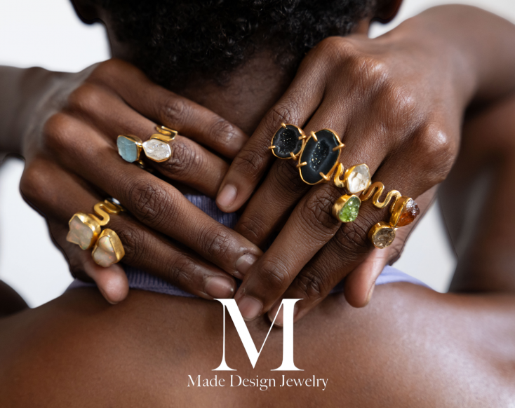 天然石の個性を生かした一点物や、柔らかな曲線が印象的なデザインは、すべてデザイナー自身が原型から手がけ、一点ずつ丁寧に仕上げています。