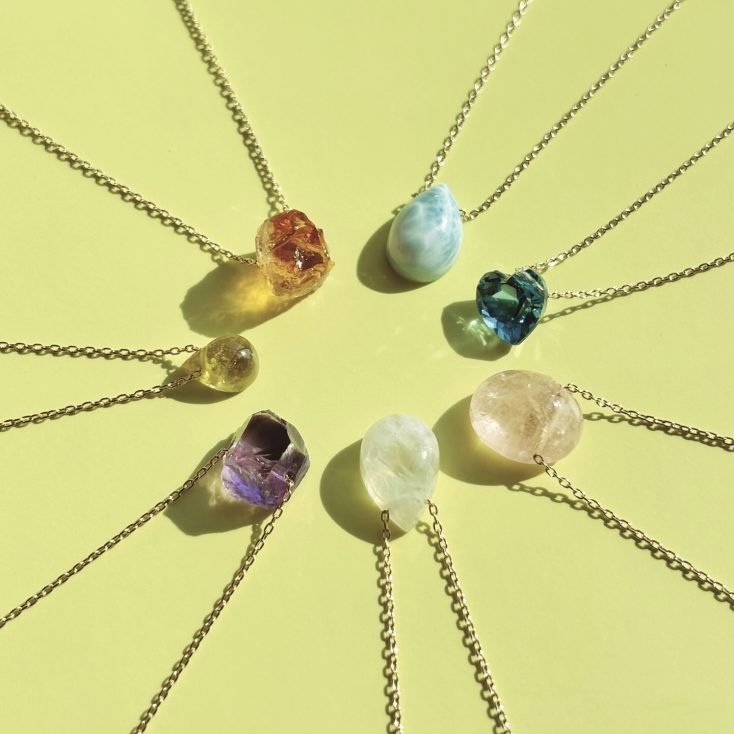 K10YGネックレス 上段水色のものから時計回りでティアドロップ ラリマー円69,300円、ハートカット ロンドンブルートパーズ 69,300円、カボション モルガナイト 69,300円、ティアドロップ レインボームーンストーン 63,800円、かっこみアメシスト 63,800円、ティアドロップ スフェーン 71,500円、かっこみシトリン 63,800円