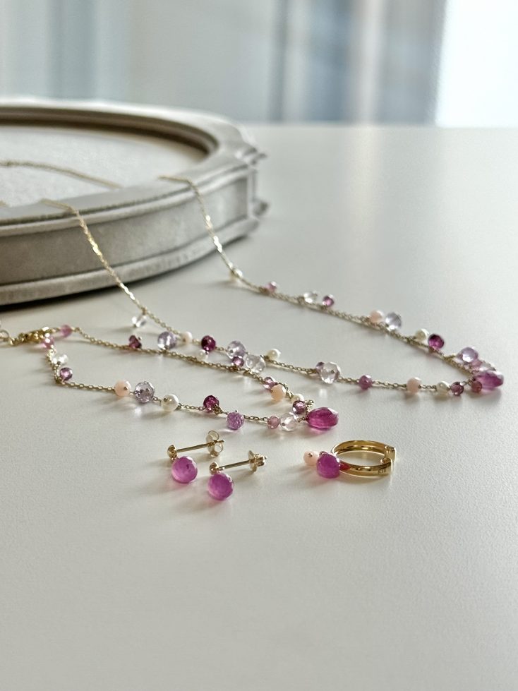 ルビー& ピンクfluffyネックレス(K10)¥60,500、ブレスレット(K10)¥60,500 など